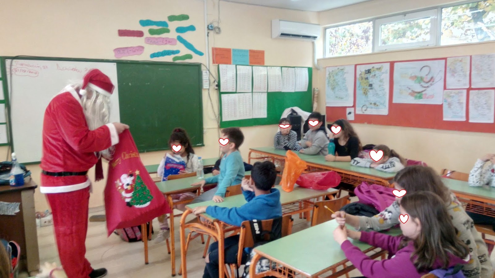 κόκκινη φορεσιά του και γεμάτο το σάκο του με δώρα ήρθε στο σχολείο μας και